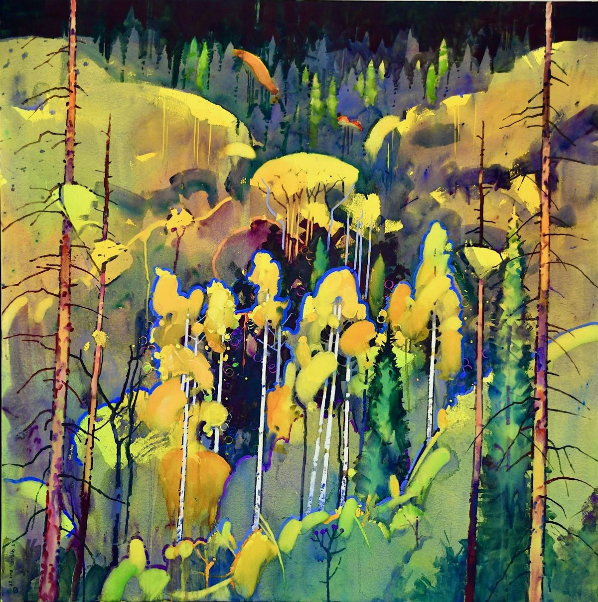 My primary demo will be the use of color with water media. I will start by working on toned, rough watercolor paper. Because I live in the mountains of Colorado, I will choose a theme and subject matter that relates to my region. On this toned surface, I will discuss and then apply granulating and staining watercolor while the paper is drying and will then lift back to the undertone and apply more watercolor to develop the subject.