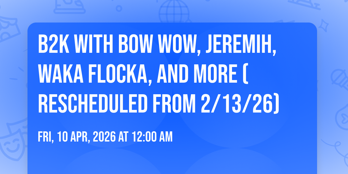 📍 Location: 33.7566, -84.3969🎉 Welcome to B2K with Bow Wow, Jeremih, Waka Flocka, and more (Rescheduled from 2/13/26), where dreams come alive and possibilities are endless! 🏛️ Join us at State Farm Arena in the heart of Atlanta, GA for an event that defies expectations. 📅 On April 10th, 2026 at 12:00 AM, be part of something truly extraordinary as we bring together innovation, entertainment, and pure magic. ✨ Every aspect has been carefully designed to ensure an unforgettable experience for all our guests. Whether you're seeking adventure, inspiration, or simply a break from the ordinary, this event promises to deliver beyond your wildest dreams. 🎊 Prepare for a journey into the extraordinary!