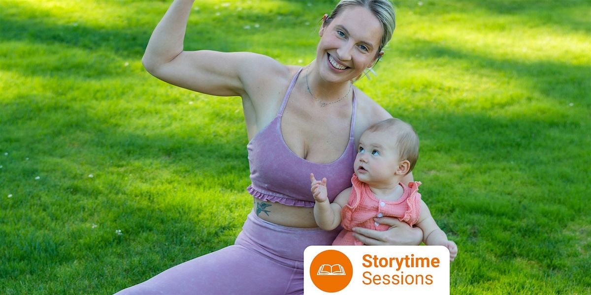 [Image Description: Photo of woman smiling wearing workout clothing, sitting on grass with baby. Text reads Storytime Sessions. ]