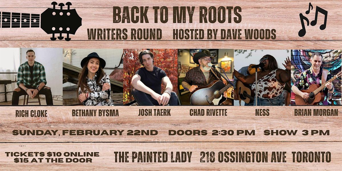 Back To My Roots is a Nashville-style writers round where the artists share their songs & the stories behind them. The February 22nd lineup features Rich Cloke, Bethany Bysma, Josh Taerk, Chad Rivette, Ness & Brian Morgan. Enjoy a mix of country, rock & roots from these dynamic performers who also perform a favourite cover song during the show. This up close & personal view of artists & their inspirations is a must-see show for music fans! The show is hosted by Dave Woods from the online social media brand In The Country with Dave Woods. Dave has been hosting writers rounds for over 10 years & also hosts a country music podcast. In 2023 & 2024, Dave was named Industry Person of the Year by the Country Music Association of Ontario & was nominated again in 2025. Make your plans now to attend Back To My Roots at The Painted Lady!