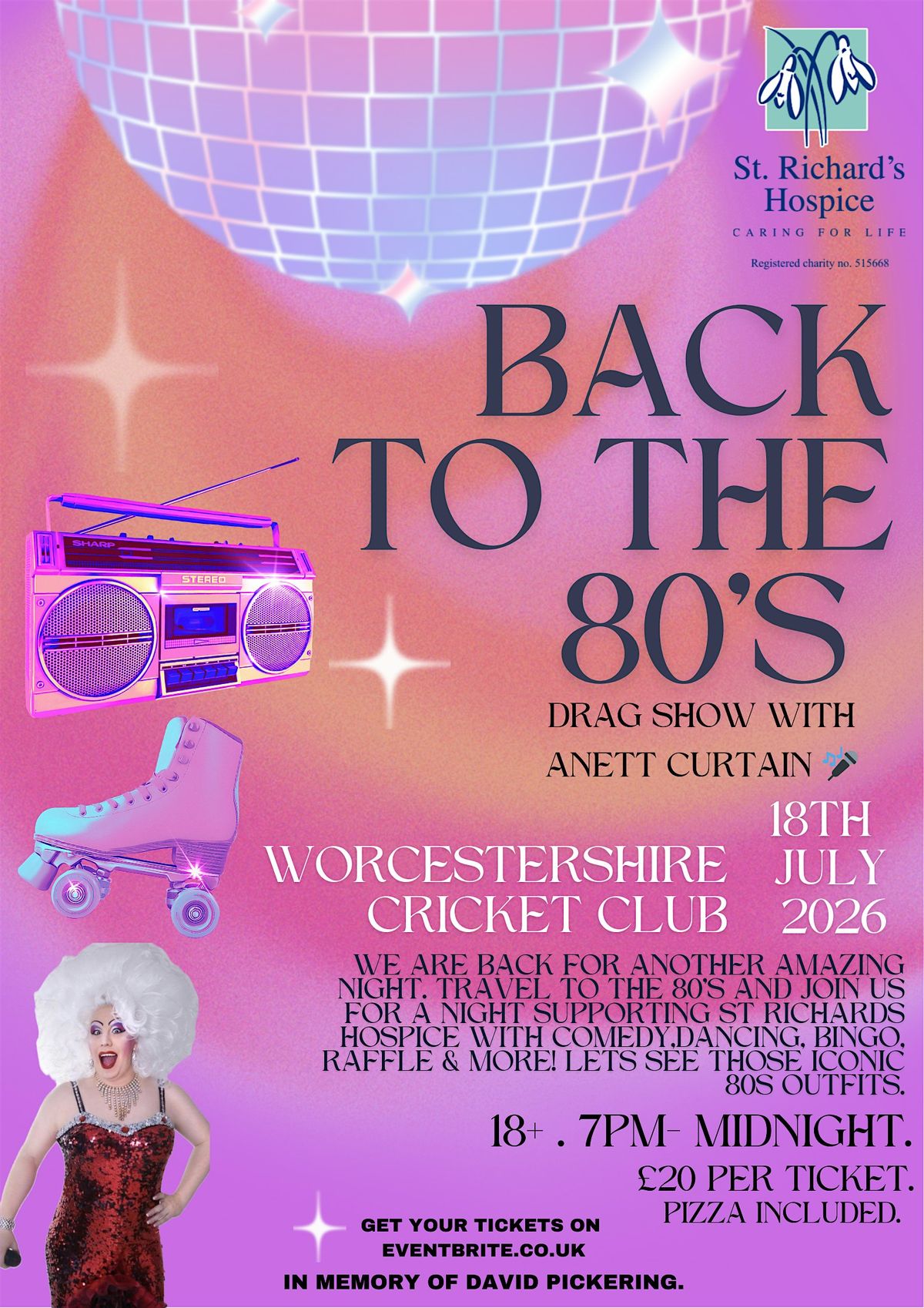 Join us on Saturday 18th July 2026 at 7:00PM for an epic 80s-themed drag show in support of our incredible local hospice, St Richard’s.