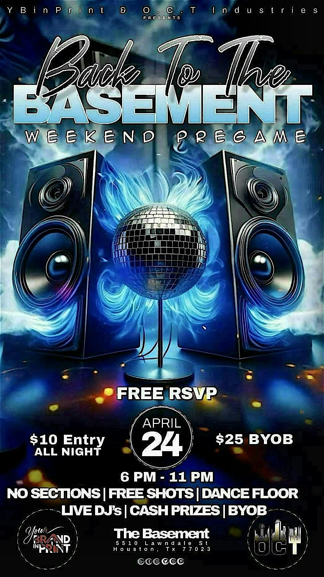 Back to the Basement – April 24 | 6–11PM. Houston’s weekend pregame with real dance floor vibes. Free shots at entry. BYOB. No sections.