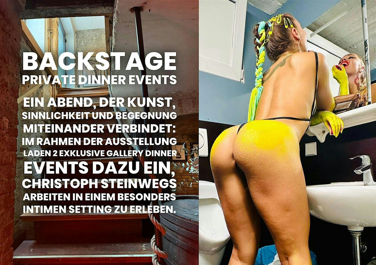 Im Rahmen der Ausstellung BACKSTAGE laden zwei exklusive Private Gallery Dinner Events dazu ein, Christoph Steinwegs Arbeiten in einem besonders intimen Setting zu erleben. Diese Abende sind als sinnliche Gesamterfahrung gedacht - persönlich, nahbar und bewusst kuratiert. Zwischen Fotografie, Performance und kulinarischem Genuss entsteht ein Raum, in dem sich Kunst nicht nur betrachten, sondern spüren lässt. In kleiner Runde öffnet sich die Galerie nach Ladenschluss für ein gemeinsames Dinner, begleitet von Live-Performances und persönlichen Einblicken des Künstlers.