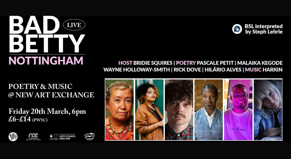 Award-winning publishing house Bad Betty Press presents poetry from Pascale Petit (Mama Amazonica winner RSL Ondaatje, and Laurel prizes), Malika Kegode (Imison Award shorlist), Wayne Holloway-Smith (T.S Elliot Prize Shortlis), Rick Dove (Hammer and Tongue slam champion), Hilario Alves (GOBS) and music and words from Harkin.