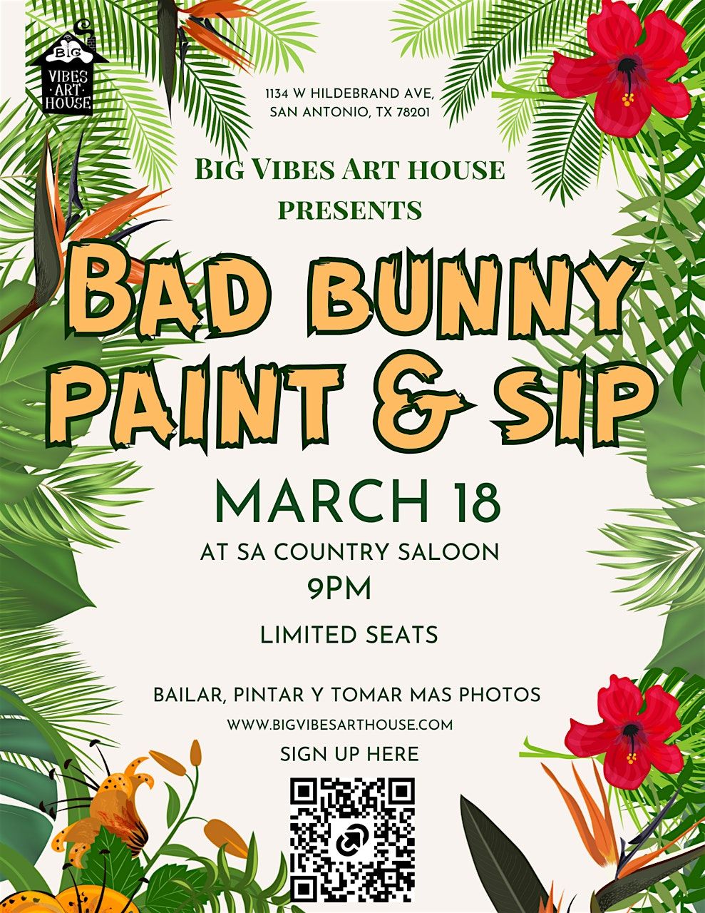 On March 18 at 9PM, Big Vibes Art House is taking over SA Country Saloon for a night inspired by the global icon, the vibe curator, the genre-bender himself. This isn’t your quiet little paint class… this is a full reggaeton-infused creative experience.