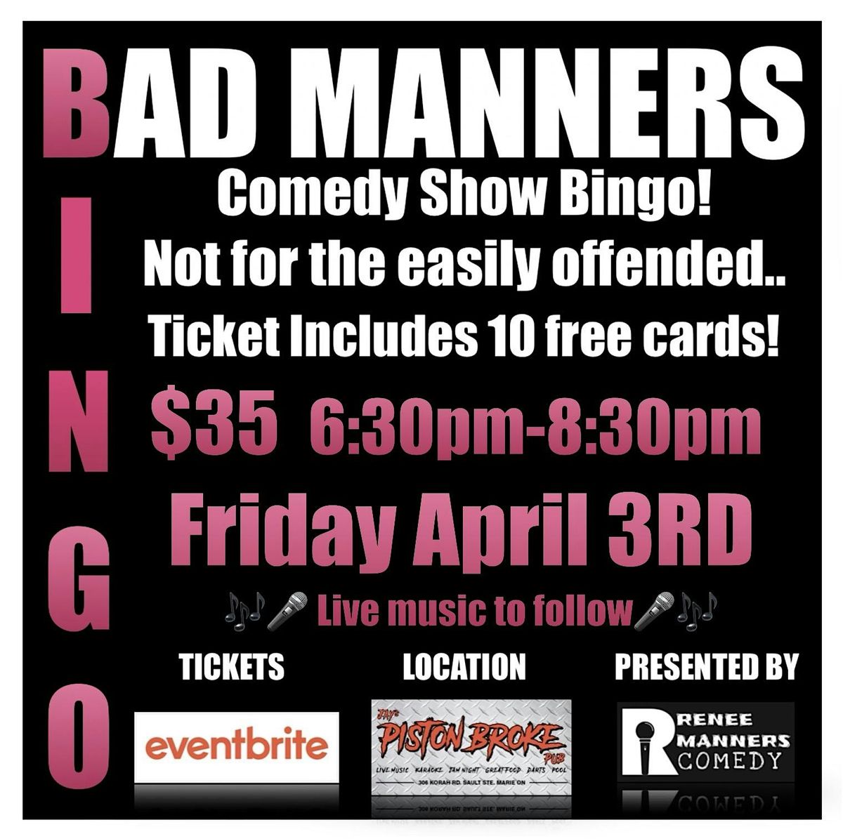 BAD MANNERS BINGO! If you think you know what to expect, you will definitely be surprised! Incredible Laughter and outrageous prizes!About this Event