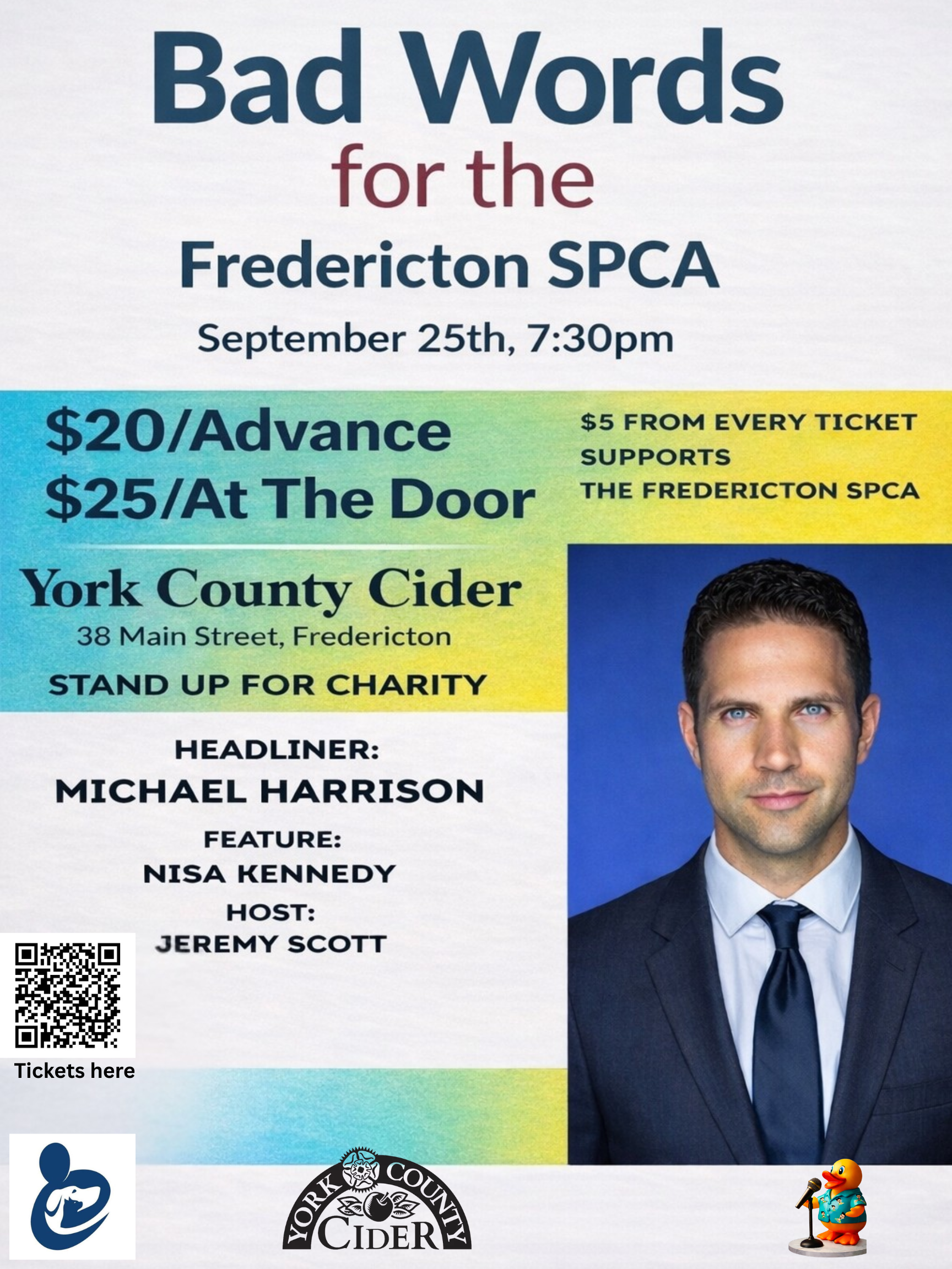 Bad Words for a Good Cause brings a stacked night of stand-up comedy to the beautiful York County Cider in support of the Fredericton SPCA. Expect sharp jokes, huge laughs, and a room full of people coming together to help local animals.