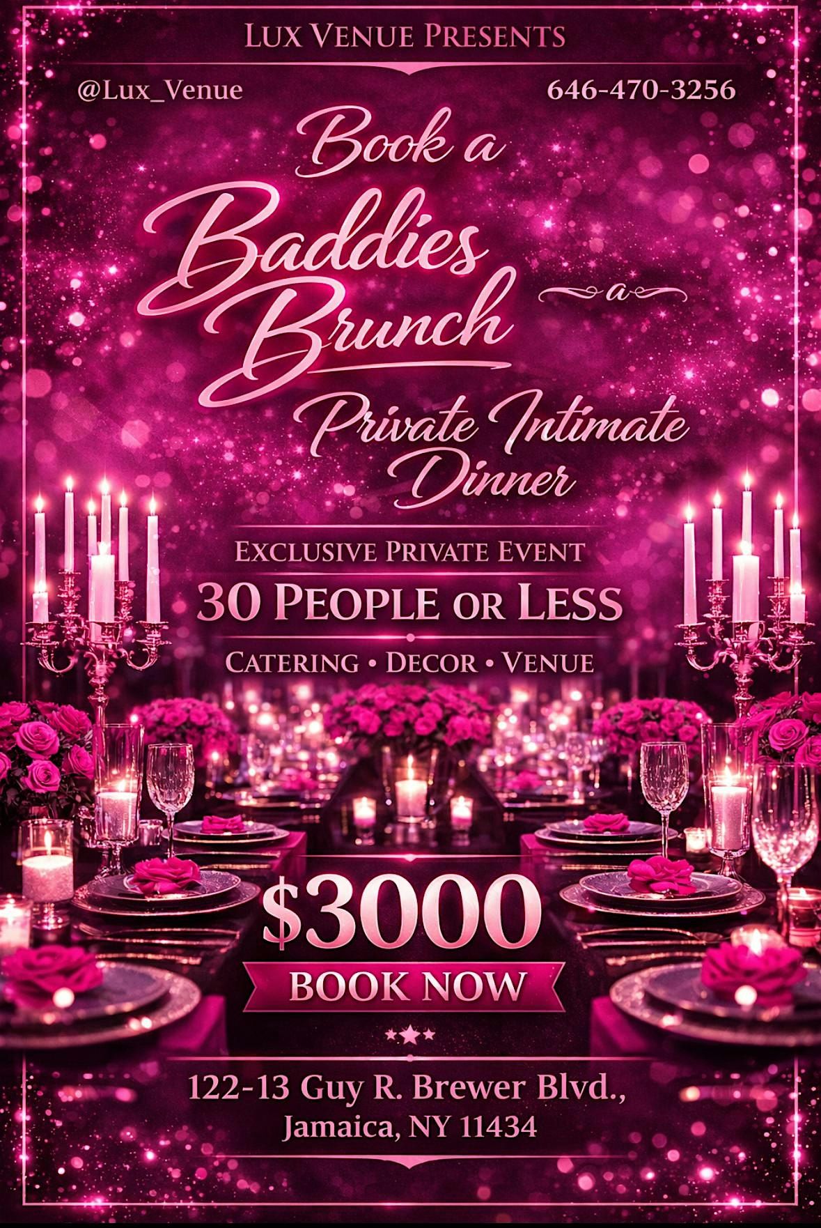 Baddies Brunch at Lux Venue is a private, by-appointment-only brunch booking designed for women who love luxury, connection, and unforgettable vibes. This is not a public event—the entire venue is reserved exclusively for you and your guests.