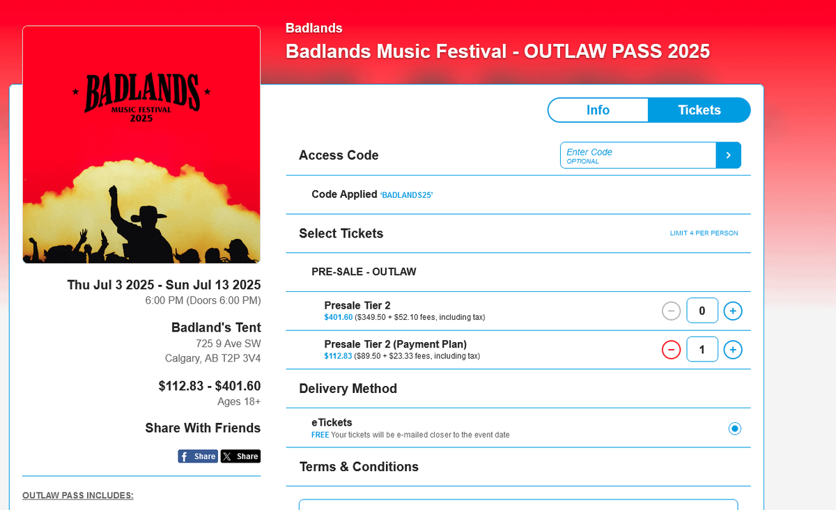📍 Location: 51.0454, -114.081🎉 Welcome to Badlands Music Festival - Tuesday Pass (18+), where the impossible becomes possible and dreams take flight! 🏛️ Join us at Badland's Tent in the heart of Calgary, AB for an event that will redefine your expectations. 📅 On July 8th, 2026 at 12:00 AM, witness the transformation of space and time into something truly magical. ✨ It's a curated experience combining the best of innovation, entertainment, and community spirit, creating moments that will be remembered for years to come. Whether you're a first-time visitor or a seasoned enthusiast, prepare to be amazed. 🎊 Book now to ensure your place in this unforgettable experience!