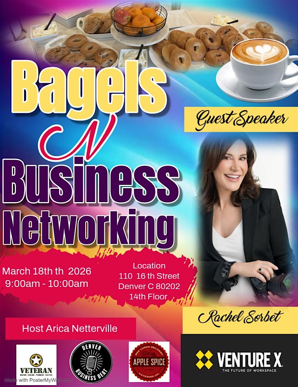 Bagels N Business our next eventFrom 9:00am to 10:30am March 18th. 2026 at Venture X Denver Uptown Speaker Rachel Sorbet Host Arica Netterville The Denver Business Beat Podcast Food Sponsor Veteran Heating, Cooling, Plumbing & Electric and Apple Spice Denver Free Breakfast and Coffee Door Prizes. Amazing networking in a beautiful space with door prizes and 1 minute business intro. See you there at the newest networking spot in town come connect and do business or a one-on-one on the 14 floor with views to be inspired by. Location 110 16th Street Denver Co 80202 info line 720-955-2582. Here's the link to register