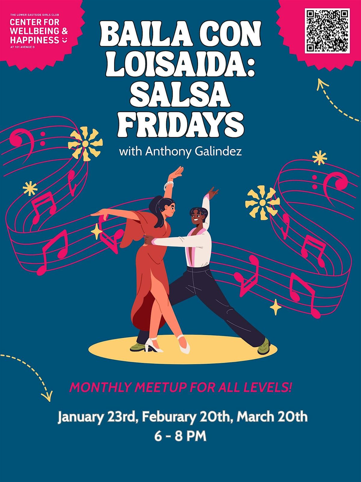 Join the Center for Wellbeing & Happiness for Salsa Fridays with Salsa Instructor Anthony Galindez. This will be a monthly workshop (1/23, 2/20, 3/20), open to all levels, where you can groove with the community with our live Salsa DJs and learn this beloved dance!