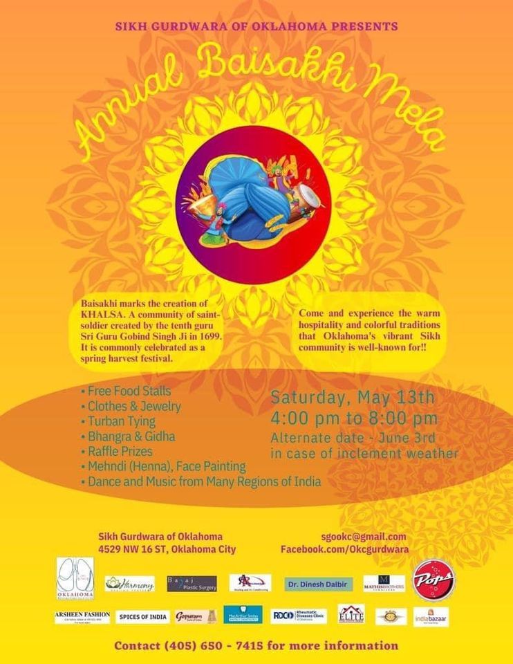 Baisakhi marks the creation of KHALSA. A community of saint-soldier created by the tenth guru Sri Guru Gobind Singh Ji in 1699It is commonly celebrated as spring harvest festival. Come and experience the warm hospitality and colorful traditions that Oklahoma's vibrant Sikh community is well-known for!