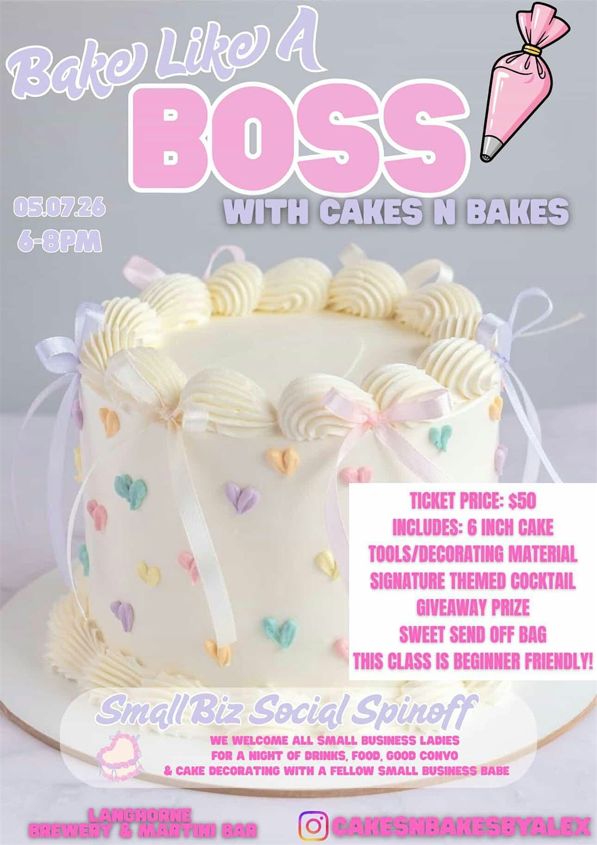Get ready to level up your baking skills in this super fun, hands-on cake class! Join us in person and learn all the tips and tricks to decorate a cake like a total BOSS. Enjoy the company of other like-minded, small business owners. Bounce off ideas, learn about their business and follow each others socials! Whether you're a beginner, just want to sharpen your skills or just want to network, this class is perfect for anyone who loves cake and wants to create something amazing! Donβt miss out on this sweet opportunity to bake, laugh, and share tasty treats with fellow cake lovers.