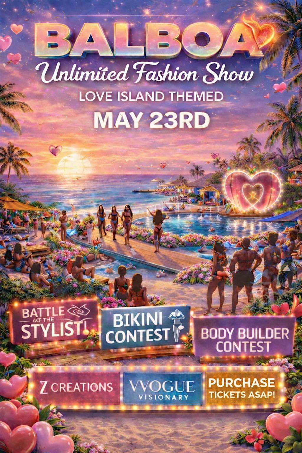 Get ready to dive into style at the Balboa Unlimited Love Island Fashion Show! Join us in person for an unforgettable experience filled with vibrant looks and island vibes. It’s all about celebrating bold fashion and good times. Don’t miss out on the fun and flair—see the latest trends come alive on the runway in a chill, lively setting. Bring your friends and let’s make some awesome memories together!