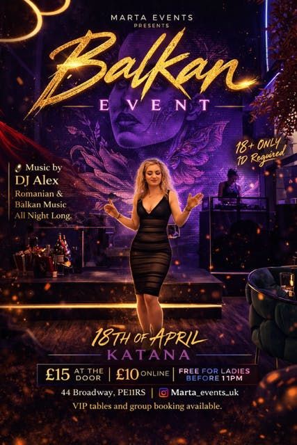 Balkan EventGet ready for a night full of energy, music and unforgettable vibes! Marta Events invites you to the Balkan Event at Katana on 18th of April in Peterborough.