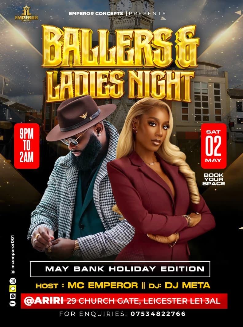 Emperor Concepts presents to you Ballers and Ladies Night happening in the city of Leicester.This will be all round entertainment night featuring music, comedy, dance and party. It’s a Night for the Big Boys and Sexy Ladies to step out and have some fun. The venue is Ariri Restaurant and Bar Church Gate Leicester.Come pop the champagne let’s party!