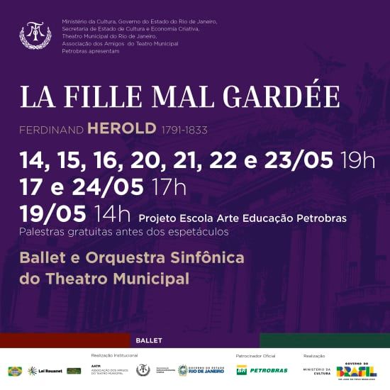 ATENÇÃO! NÃO SERÁ PERMITIDA A ENTRADA NA SALA APÓS O INÍCIO DO ESPETÁCULO. ALERTAMOS QUE, EM DIAS DE ESPETÁCULOS, NÃO SERÁ PERMITIDA A ENTRADA DE PESSOAS TRAJANDO ROUPAS CURTAS ACIMA DO JOELHO, ROUPAS DE BANHO, SHORTS E/OU CALÇADOS COMO CHINELOS E CROCS Ingressos para Ballet - La Fille mal Gardée, no Theatro Municipal do Rio de Janeiro 🎫 Plateia/Balcão (escolha durante a compra) Inteira Meia-entrada O que você vai curtir 🎻 O Theatro Municipal do Rio de Janeiro traz mais um espetáculo inesquecível! 🎼 Uma fantástica apresentação que promete envolver o público do início ao fim 🏛️ Desfrute de ambiente espetacular em um dos mais tradicionais espaços culturais do Rio de Janeiro Informação Quinta-feira, 14 de maio de 2026 – Início às 19h – Abertura das portas às 18h Sexta-feira, 15 de maio de 2026 – Início às 19h – Abertura das portas às 18h Sábado, 16 de maio de 2026 – Início às 19h – Abertura das portas às 18h Domingo, 17 de maio de 2026 – Início às 17h – Abertura das portas às 16h Quarta-feira, 20 de maio de 2026 – Início às 19h – Abertura das portas às 18h Quinta-feira, 21 de maio de 2026 – Início às 19h – Abertura das portas às 18h Sexta-feira, 22 de maio de 2026 – Início às 19h – Abertura das portas às 18h Sábado, 23 de maio de 2026 – Início às 19h – Abertura das portas às 18h Domingo, 24 de maio de 2026 – Início às 17h – Abertura das portas às 16h ⏳ Duração: 1h45 minutos 📍 Local: Theatro Municipal do Rio de Janeiro 👤 Idade: livre para todas as idades ♿ Acessibilidade: local acessível para cadeirantes ❓ Você pode consultar as perguntas frequentes (FAQs) deste evento aqui 👉 Consulte todos os detalhes sobre a meia-entrada aqui Descrição Um dos grandes balés do século XVIII retorna ao palco do TMRJ: La Fille Mal Gardée, com música de Ferdinand Hérold. Com Ballet e Orquestra Sinfônica da casa. A versão original foi apresentada em julho de 1789, no Grand Théâtre de Bordeaux, na França. Entre os coreógrafos que recriaram esse balé, um deles foi Marius Petipa, em 1885, quando apresentou sua versão em São Petesburgo, na Rússia. Surgiram outras produções através do século ** e, em 2024, o espetáculo com concepção e coreografia do uruguaio Ricardo Alfonso, encenado pelo Ballet Nacional Sodre, de Montevidéu, foi apresentado com o Ballet e Orquestra Sinfônica do Municipal com grande repercussão. Agora, a produção retorna à programação, novamente com concepção e coreografia de Ricardo Alfonso. A regência será de Jésus Figueiredo.