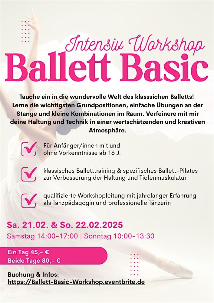 Tauche ein ganzes Wochenende ein in die wundervolle Welt des klassischen Balletts! Dieser Workshop richtet sich an Anfänger/innen mit und ohne Vorkenntnisse ab 16 Jahren. Du lernst die wichtigsten Grundpositionen, einfache Übungen an der Stange und kleine Kombinationen im Raum. Gemeinsam arbeiten wir an deiner Sicherheit in der Technik, einer präziesen Ausführung, sowie einer aufrechten und gesunden Haltung.