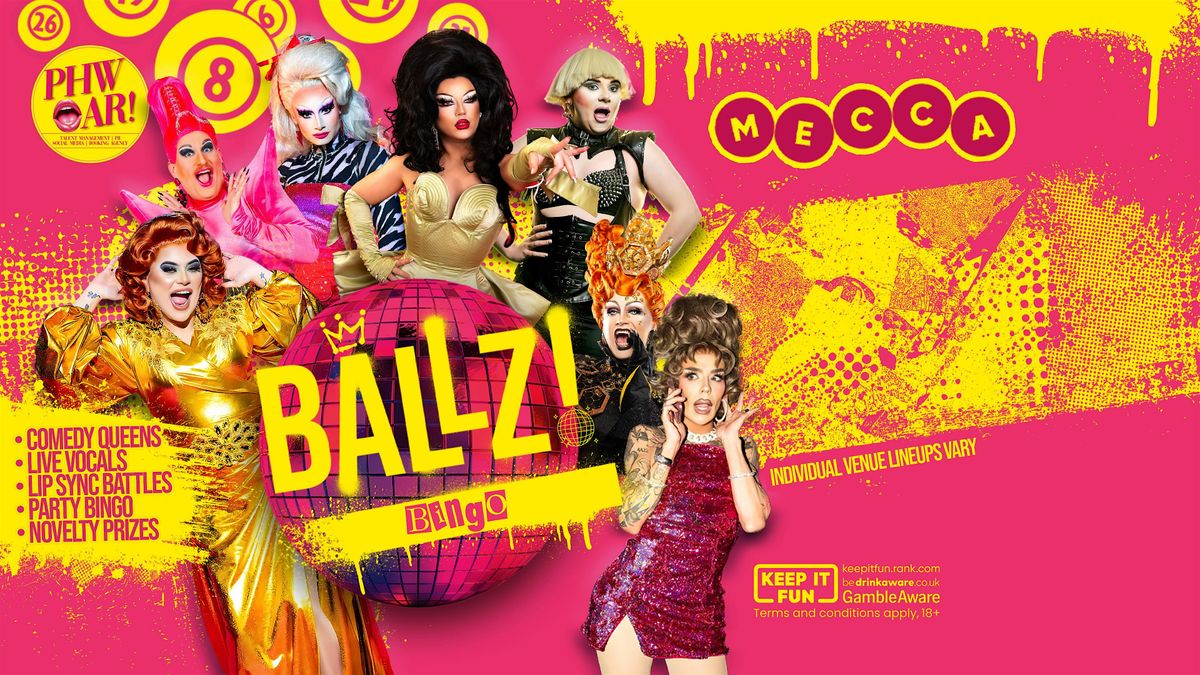 Ballz! Bingo is a high-camp, all-out party experience bringing together comedy queens, kings and things, incredible live vocal performances, audience games and party bingo — taking over Mecca venues across the UK in 2026.