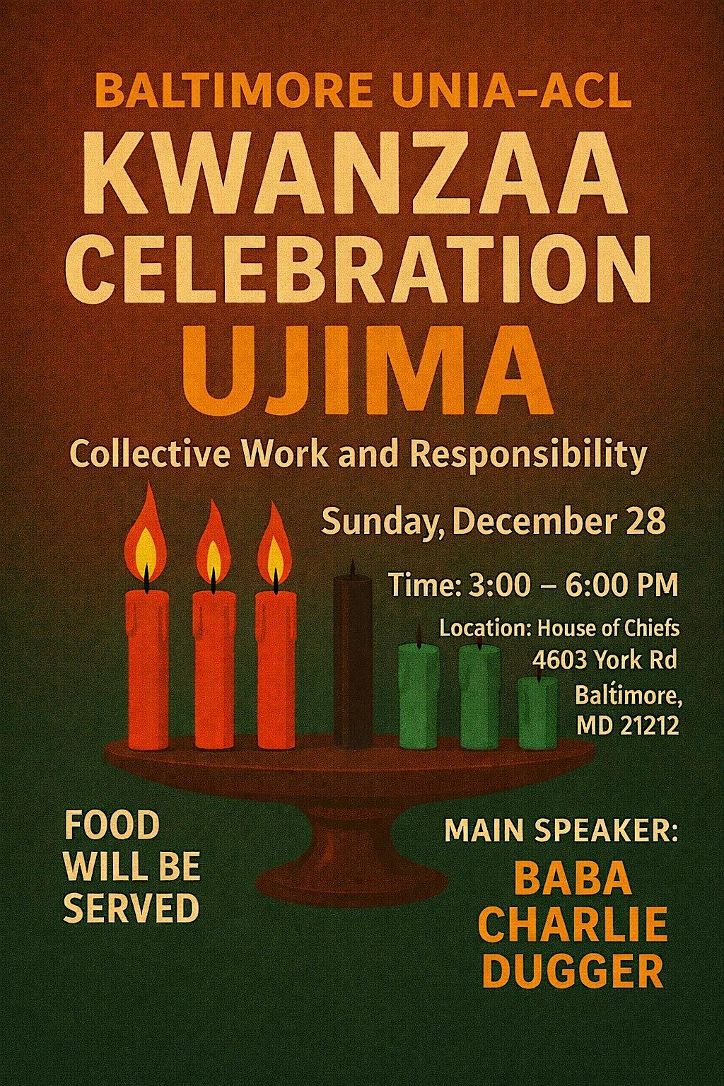 Celebrate Kwanzaa in Baltimore with the Baltimore UNIA-ACL as we honor Ujima, the third principle of Kwanzaa, emphasizing collective work and responsibility within the Black community.