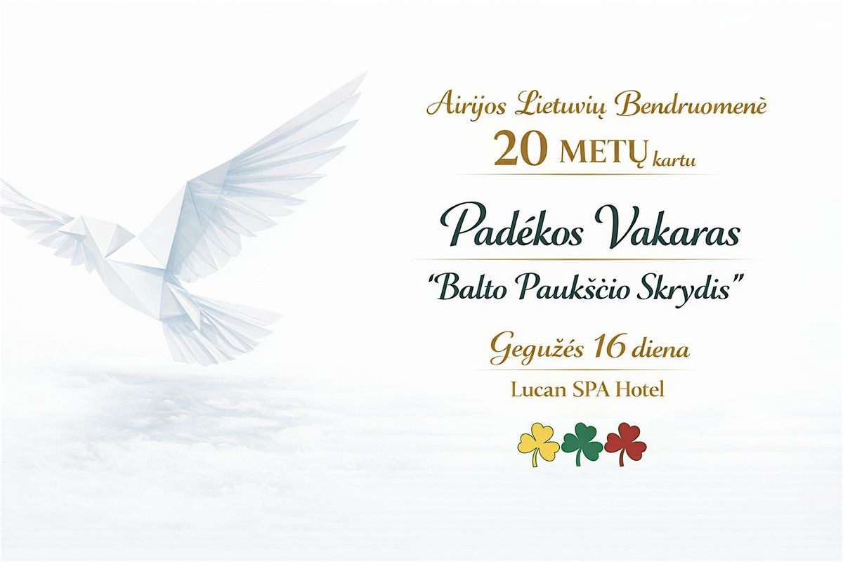 Iškilmingas Balto Paukščio Vakaras, skirtas paminėti 20 metų Airijos lietuvių bendruomenės veiklą, kviečia susiburti drauge į vakarą, kupiną simbolikos, bendrystės ir pagarbos visiems, kurie per du dešimtmečius kūrė, stiprino ir puoselėjo lietuvišką gyvenimą Airijoje.