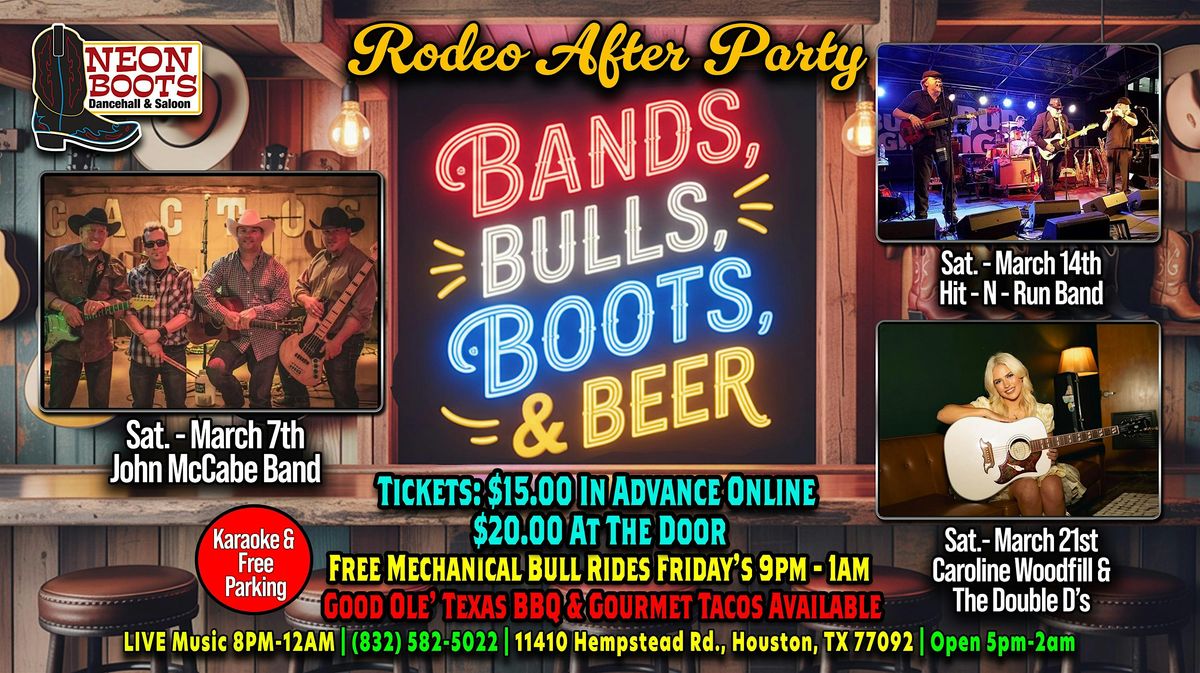 The RODEO AFTER PARTY is at Neon Boots Dancehall & Saloon with LIVE MUSIC by the HIT-N-RUN BAND on Saturday, March 14th!!!
