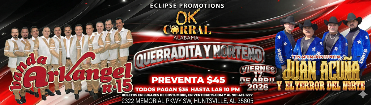 **Attend BANDA ARKANGEL R-15 & MAS at Ok Corral Alabama, Huntsville, AL, United States** Join us for BANDA ARKANGEL R-15 & MAS. It's going to be a fun and relaxed event with great music and good company. A perfect way to spend your evening. **Event Details:** * **Location:** Ok Corral Alabama, Huntsville, AL, United States Book your attendance today and be part of something extraordinary. #BANDAARKANGELR-15&MAS #event #exciting #HuntsvilleEvents #ALEvents