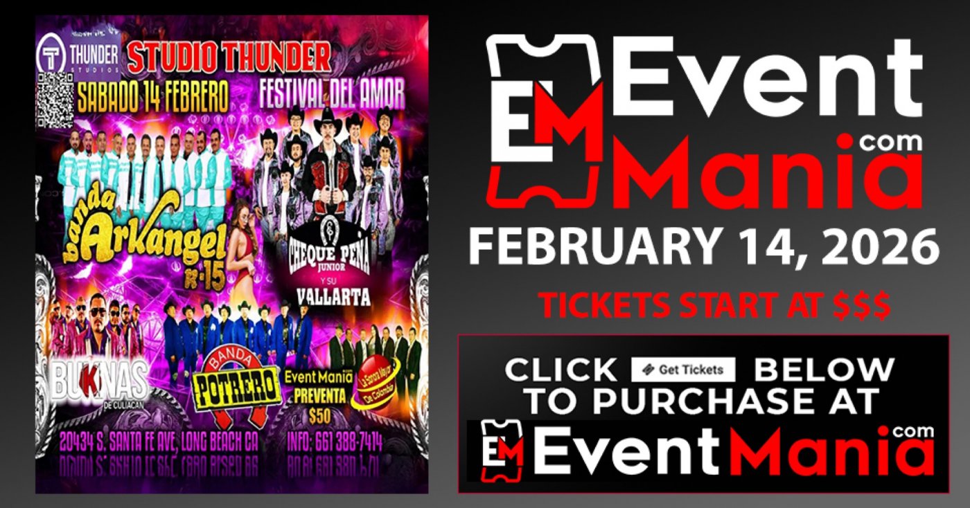 Celebra el Día de San Valentín con una noche inolvidable de música en vivo, baile y el mejor ambiente en Studio Thunder, Long Beach. El Festival del Amor reúne a grandes agrupaciones del regional mexicano para encender el escenario con sus éxitos y estilo único.