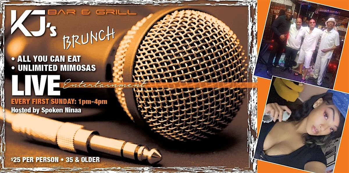 the Only $25 Brunch w. ALL U CAN EAT & UNLIMITED MIMOSAS; offering LIVE ENTERTAINMENT!!! Hosted by SpokenNinaa Every First Sunday at KJs Bar & Grill. 30 & UP grown folks VIBE to get your Month started right on a Sunday FunDay !