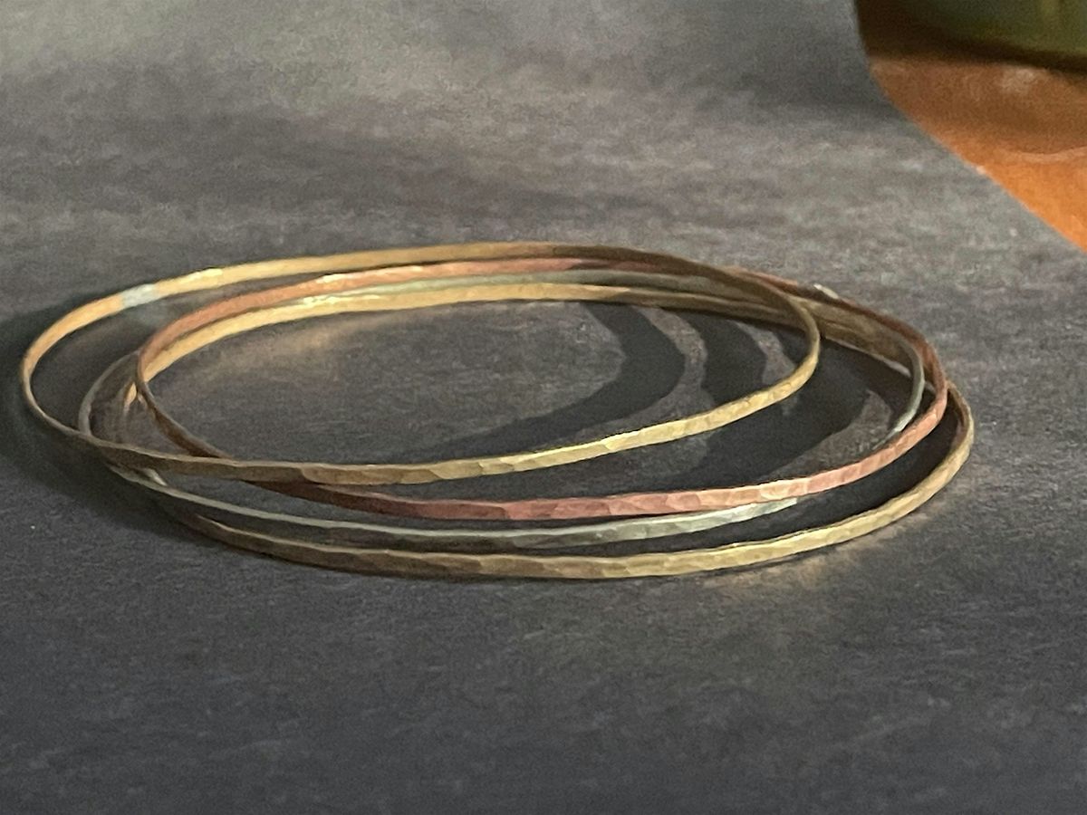 Come learn to make a stack of beautiful bangles with an introduction to metalsmithing techniques! In just 3 hours, you will be guided step by step on how to solder, file, hammer & polish. Transform sterling silver, copper, and brass wire into shiny, textured bracelets that you can wear and show off. Beginners are welcome; students with some previous experience will work on perfecting skills. All materials are included. Please bring reading glasses, if needed.