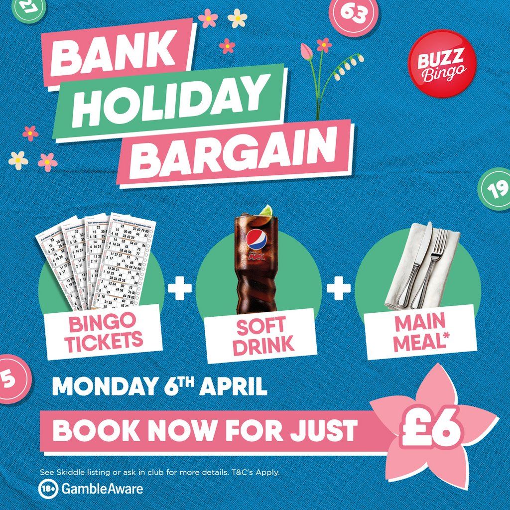 Exclusive Bank Holiday Offer when you book. Enjoy Bingo, a Burger, and a Drink for just £6. Book now!