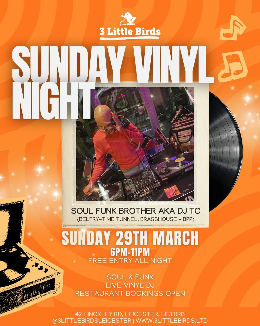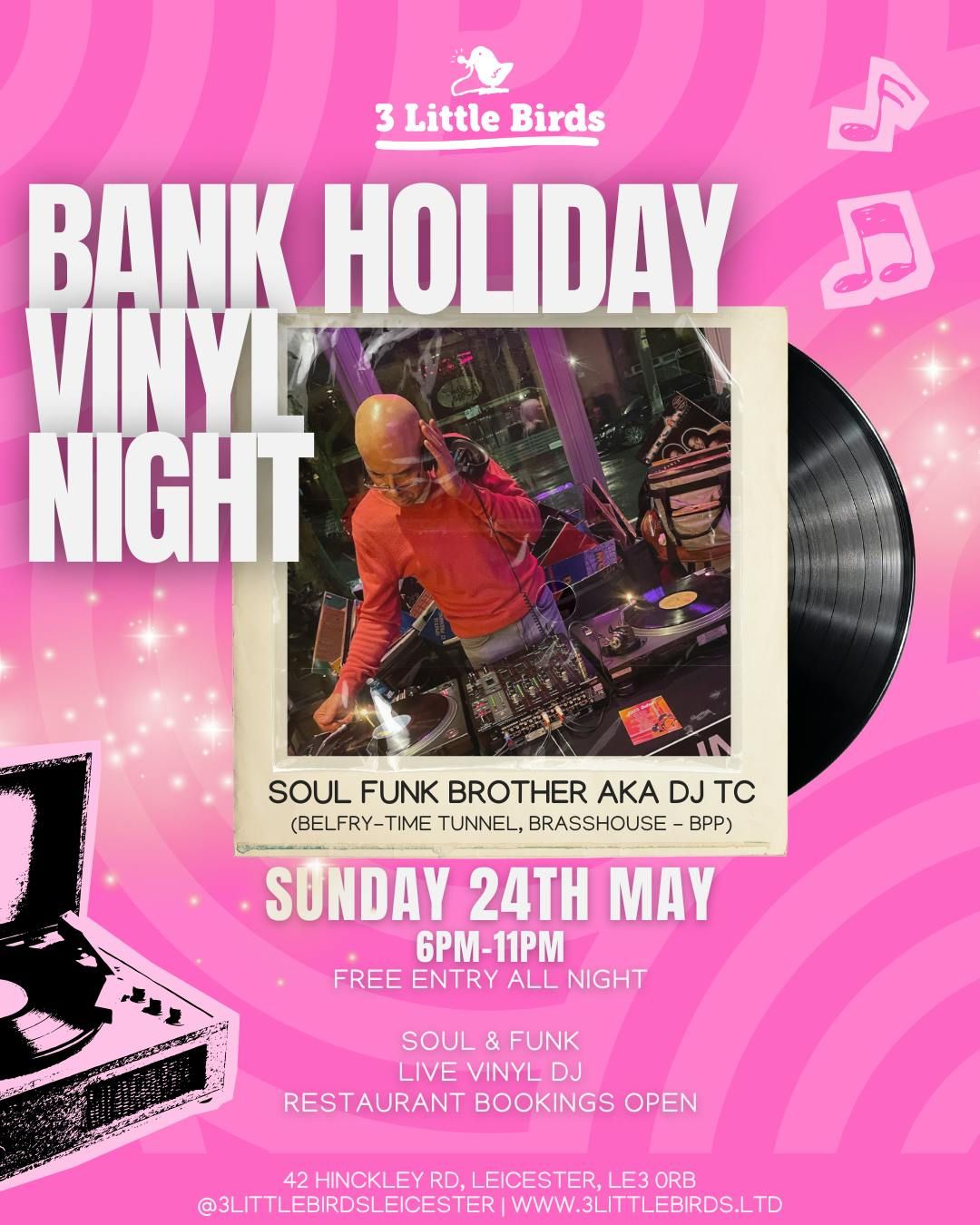 π€ VINYL NIGHT β THIRD YEAR RUNNING! π€πHead down to 3 Little Birds for a full night of Soul & Funk β strictly vinyl only β¨Real records. Real grooves. Real vibes.ππΉ Add in great food, cold drinks, and a special guest set fromπ§ DJ Soul Funk Brother (DJ TC) β bringing serious heat after rocking spots like Belfry, Time Tunnel, Brasshouse & BPP.Expect non-stop feel-good classics all night long πΆπ₯π¨ FREE ENTRY ALL NIGHT π¨ποΈ Book your free ticket early to avoid disappointment!Disclaimer: