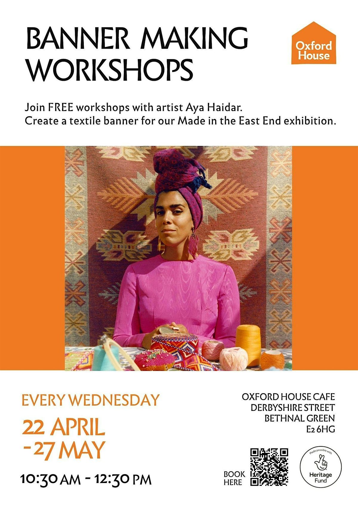 Join artist Aya Haidar for a series of hands-on creative textile workshops exploring storytelling through fabric, memory, and making. Together, participants will collaboratively create a large banner to be exhibited at Oxford House as part of our Material Histories exhibition.