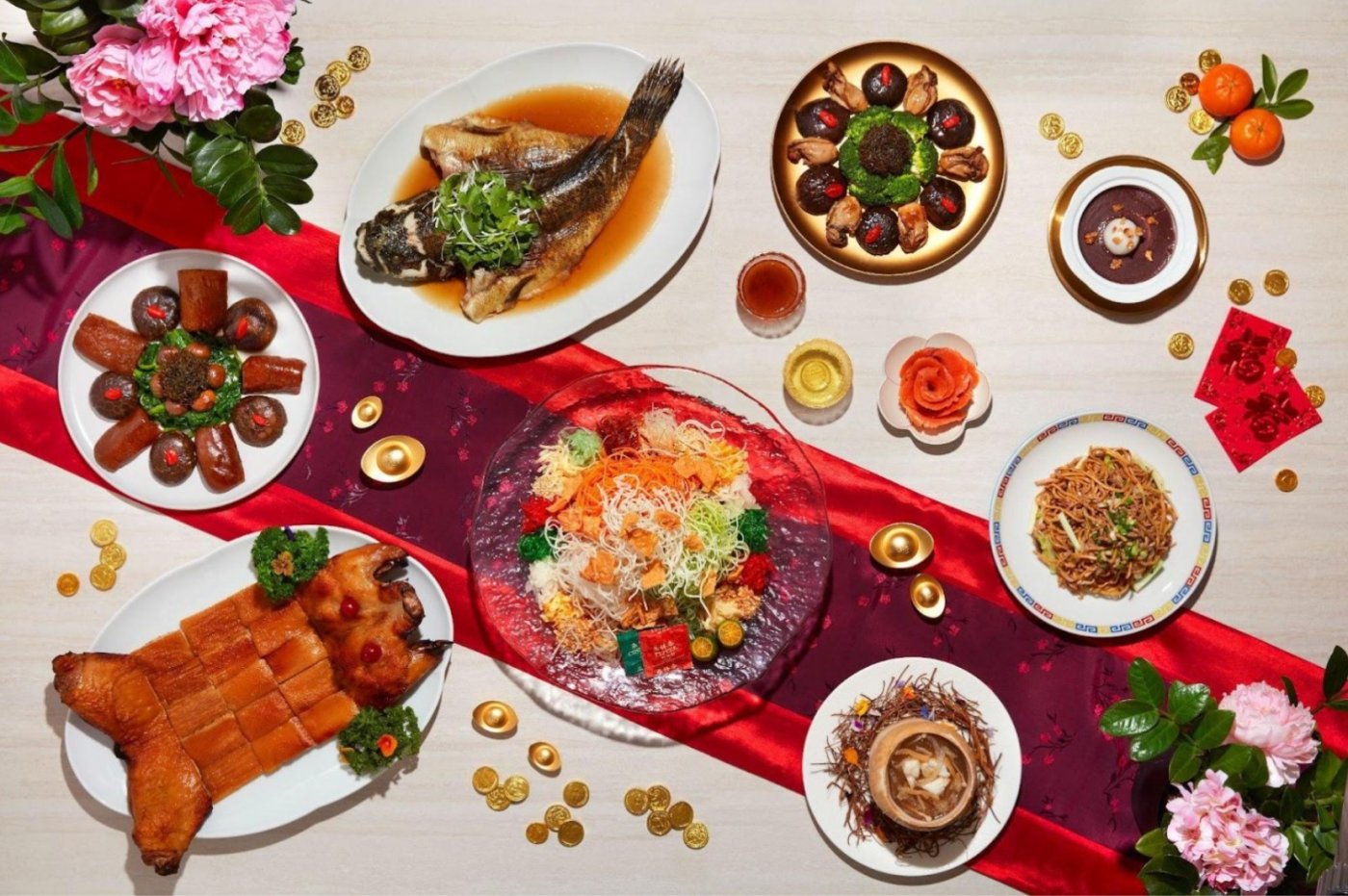 Each celebration begins with a Prosperity Smoked Salmon Lo Hei, followed by an Eight-Course Lunar New Year Set Menu available for lunch and dinner. Lunch highlights include Imperial Red Grouper with Nonya Chilli Sauce and Roasted Crispy Duck with Hoisin and Garlic. Dinner menus feature dishes such as Four Treasure Soup with abalone, fish maw, scallops and crabmeat served in a young coconut, and Suckling Pig with Homemade Hoisin Sauce.