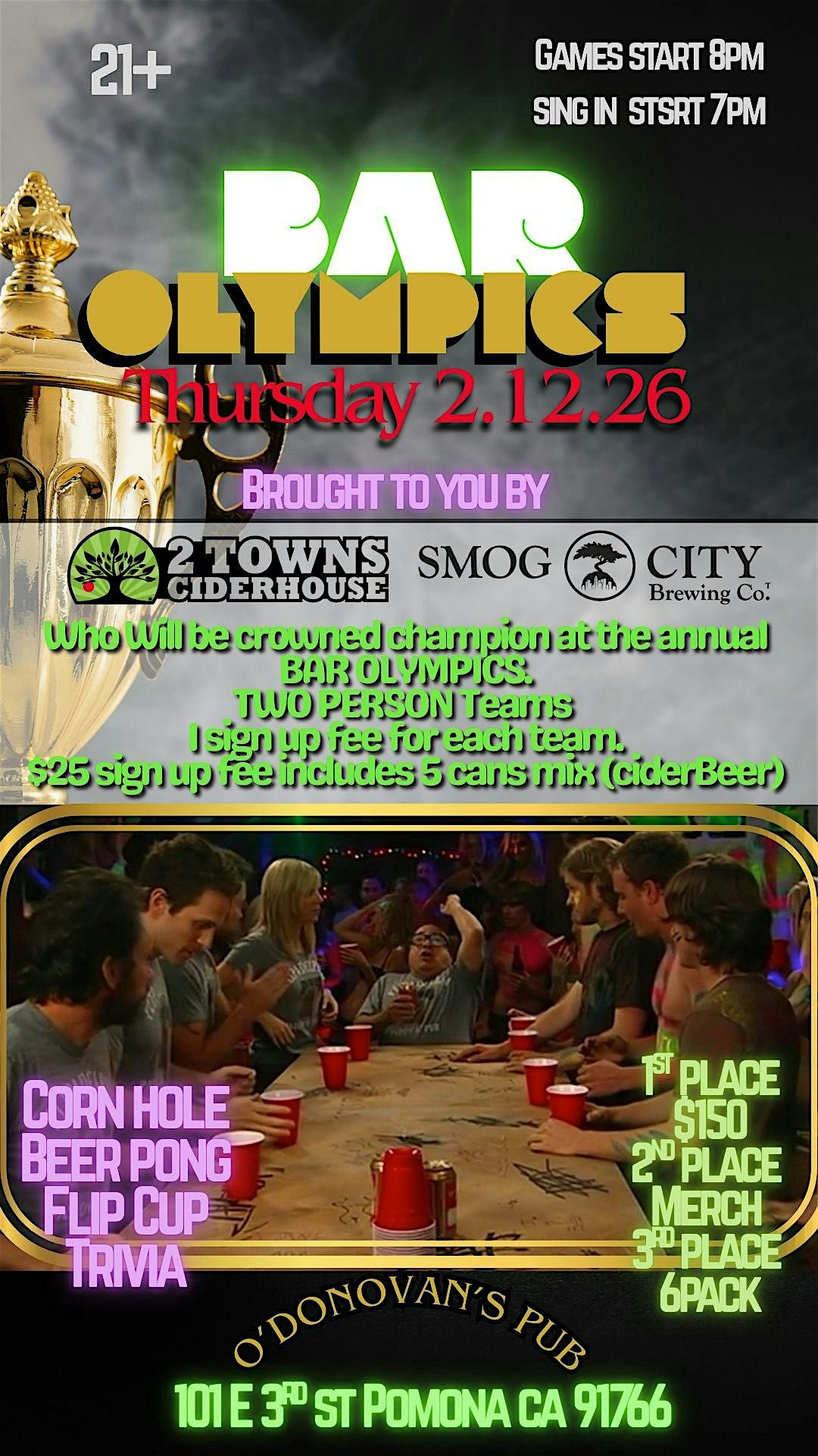 Who Will be crowned champion at the annual BAR OLYMPICS. TWO PERSON Teams