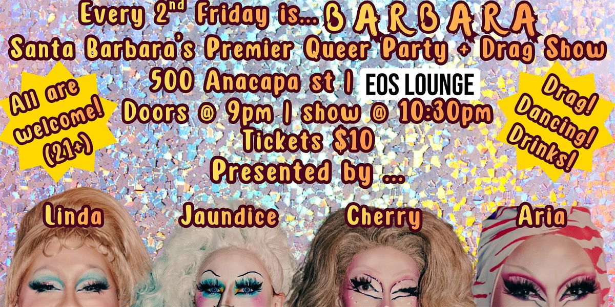 Join us at EOS on March 13th (3/13) for a night so bright, you couldn’t look away if you tried! Featuring performances by Linda, Cherry Von Illa, Mylique E. Fawcett, and Ida Problem. Hosted by the Neon Queen of SB herself, Aria Cummingtonite! Music by Santa Barbara's premier loverboy DJ Quizo and photos by Jamie Kaufman! Tickets are $10, get yours today!