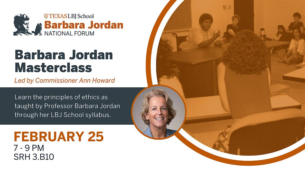 Have you ever wondered what it would be like to sit in a classroom guided by the inspiring Barbara Jordan? Well, here’s your chance! Join us for a unique educational experience where Commissioner Ann Howard (MPAff '1988) will lead a class using Barbara Jordan’s original syllabus, bringing the wisdom and passion of this legendary figure to life.