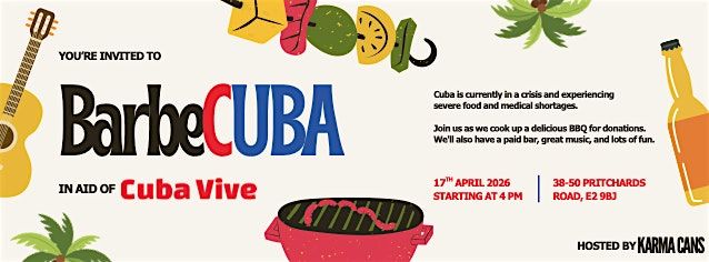 Cuba is currently in a crisis and experiencing severe food and medical shortages. Karma Cans is hosting an event on the 17th of April from 4pm onwards, BarbeCUBA, to raise funds for CubaVive’s aid appeal. Our chefs will be cooking a BBQ for donations. We'll also have a paid bar, great music, and lots of fun.