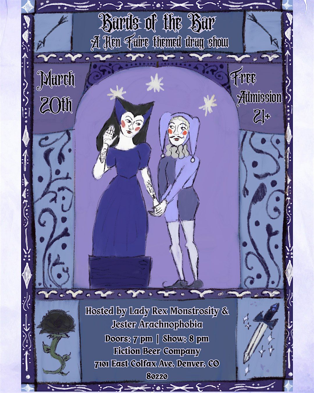 Bards of the Bar has returned to Fiction Beer Co., hosted by none other than...wait a second, Lady Rex Monstrosity? And her court jester Arachnophobia? Things are getting twisted up this time around, but we love a little chaos in the drag court! Join us for a night of ren-faire themed revelry, beer, and, of course, DRAG!