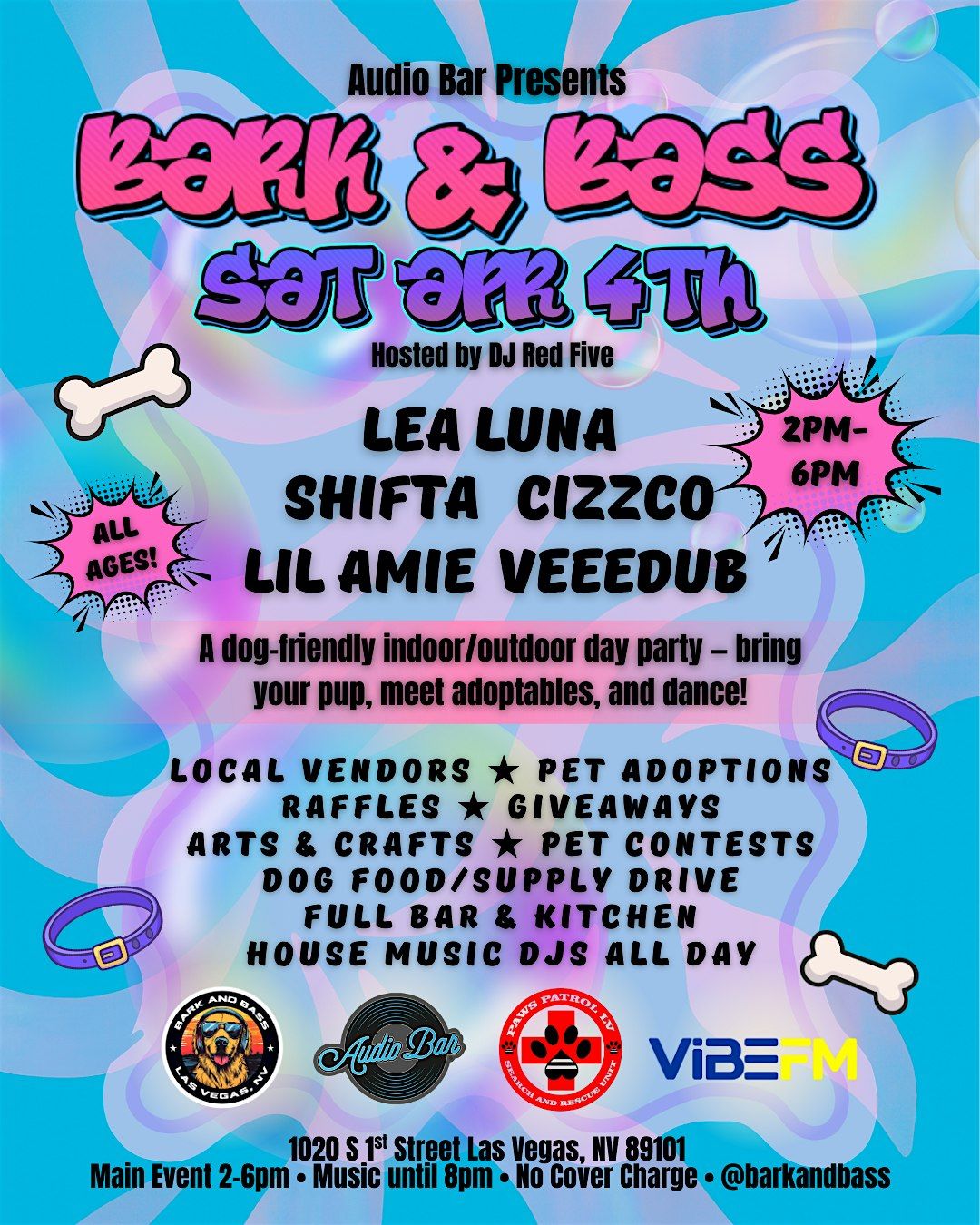 Join us for our next Bark and Bass event Saturday, April 4th at Audiobar! We are partnering with Paws Patrol LV to bring you some adorable pups up for adoption that need your help!