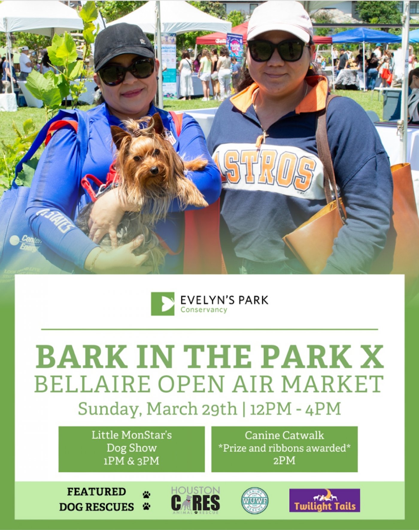 Join us at Bark in the Park X Bellaire Open Air Market Held Sunday, March 29th from 12PM - 4PM. For this one day of the year dogs are welcome at Evelyn’s Park!