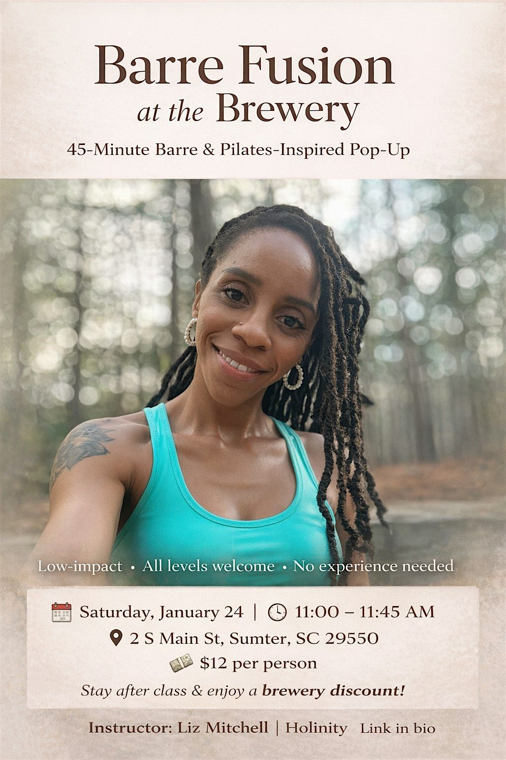 Join me for a 45-minute Barre Fusion pop-up at the brewery!