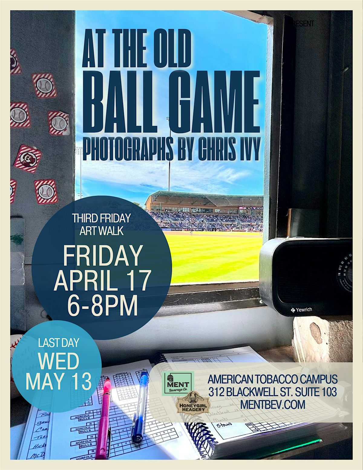 Durham Bulls baseball is in full swing and any fan wouldn’t want to miss the first showing of Chris Ivy’s photography! Chris Ivy is the man behind the manual scoreboard for the Durham Bulls. You may have seen him on ESPN, but now you can see his photography! Join us for “At the Old Ball Game” a photography show highlighting behind the scenes, chris’s points of view and fan favorites! No baseball fan will want to miss this! Last day to see these unique photographs is Wednesday, May 13.
