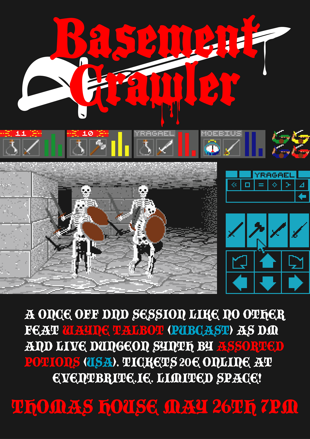 Thomas House Presents BASEMENT CRAWLER. A once off Dunegeons And Dragons game night hosted by Wayne Talbot (Pubcast) with live Dungeon Synth by Texas' own ASSORTED POTIONS.