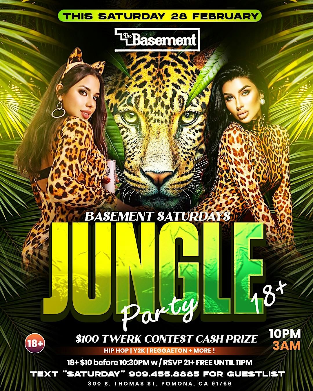 Get ready to lose yourself in the wild vibes of the Basement Pomona Jungle Party, 18+ only!