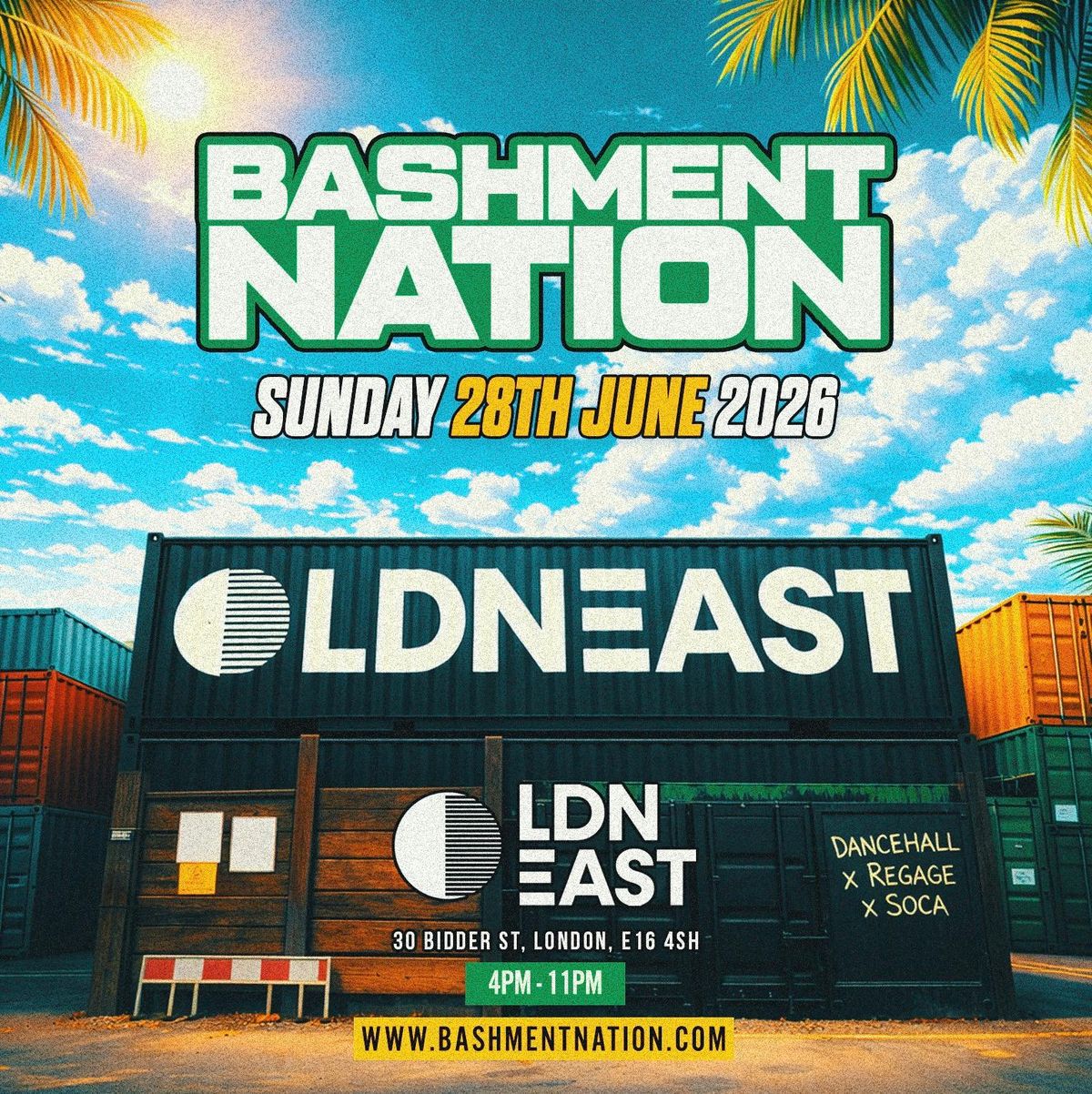 BASHMENT NATION is back for OUR biggest Day party at LDN EAST. Join thousands of Dancehall, Reggae & Soca lovers for the ultimate celebration of music, food and culture.