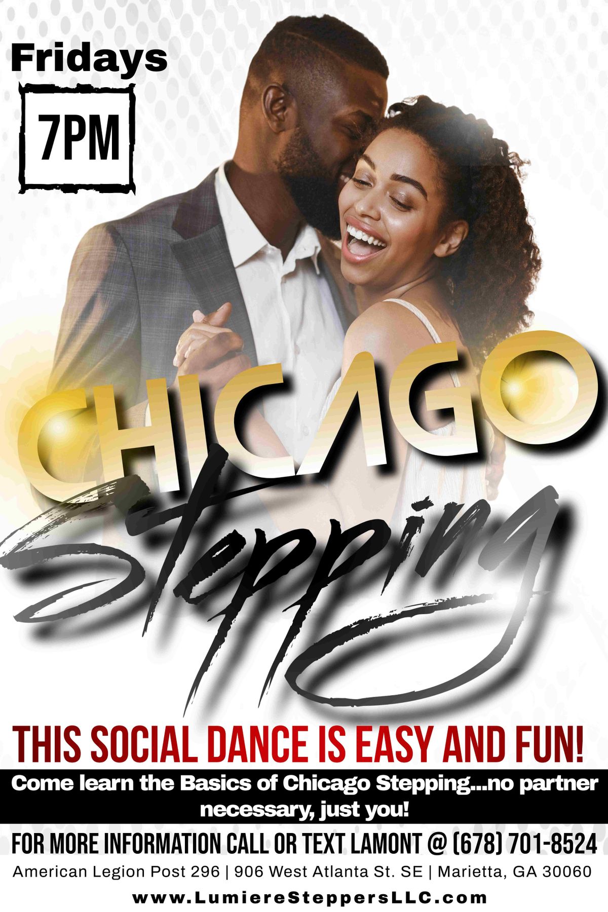 Lumiere Steppers, LLC presents Chicago Steppin' lessons at the American Legion Post 296! Come explore this beutiful art form of black cultural excellence in a fun-filled stress-free environment. Join us and start Enjoying Life One Step at a Time!