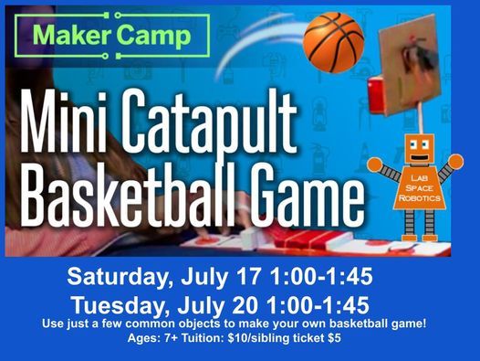We’ll be using a few simple items to create your own basketball game to take home. How will you engineer the shooting mechanism? How will you design your backboard? Parents are welcome to stay and build with their children. You’ll get to take your game home with you:)All materials supplied. This project works well for ages 7+. Younger could complete it with an adult’s hands-on help. Family tickets admit up to 3 children in the same family.