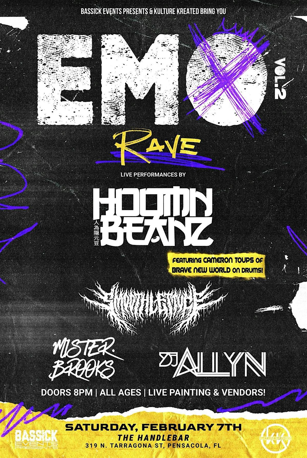 EMO RAVE — Where Sad Songs Hit HarderGet ready for a night of screaming lyrics, pounding bass, and full-send nostalgia. Emo Rave collides electronic music with emo anthems, turning heartbreak into a dance floor riot.Headlining the night is HOOMN BEANZ, delivering a high-octane DJ set with live drummer Cameron Toups of Brave New World, creating an explosive hybrid performance that blends live drums with massive electronic drops. Supporting the chaos are SmoothLettuce, DJ Allyn, and Mister Brooks, keeping the energy cranked from open to close.Saturday, February 7