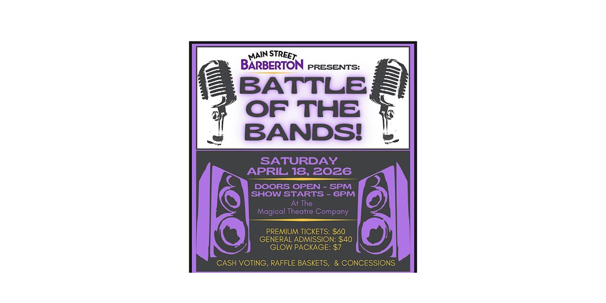 Rock out at Main Street Barberton’s Battle of the Bands! April 18, 6PM @ Magical Theatre Co. Cash prizes, raffles & more. Get tickets now!About this Event